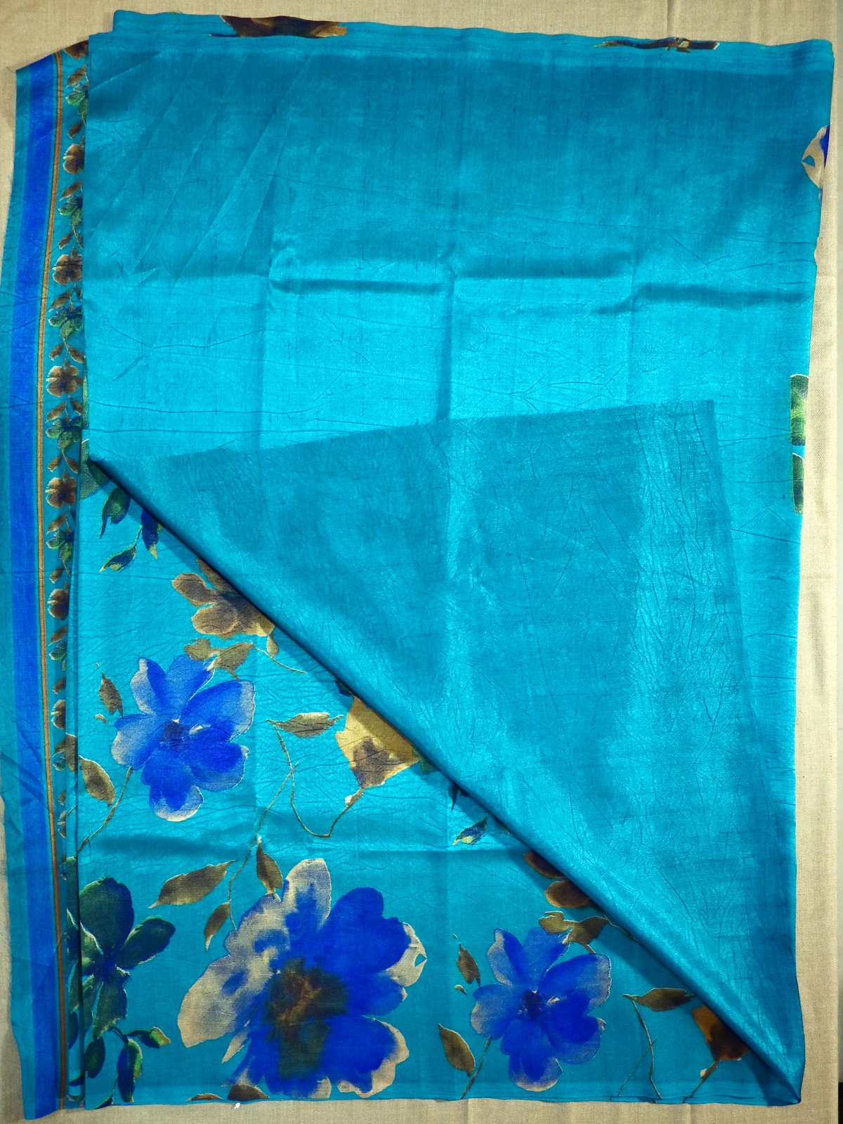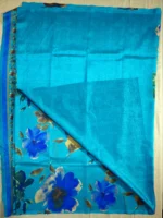 This printed Kashmiri semi silk saree sports bold floral design print on deep blue.