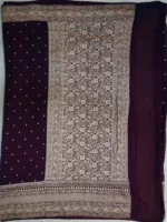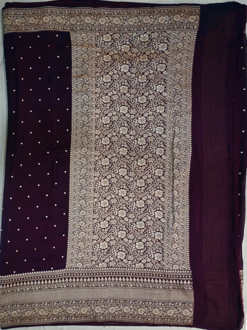 Exquisite pure khaddi georgette saree in dark coffee brown colour with shiny golden jari border and jari butti. The contrast of golden jari on dark, sheer georgette fabric gives the saree a royal look.