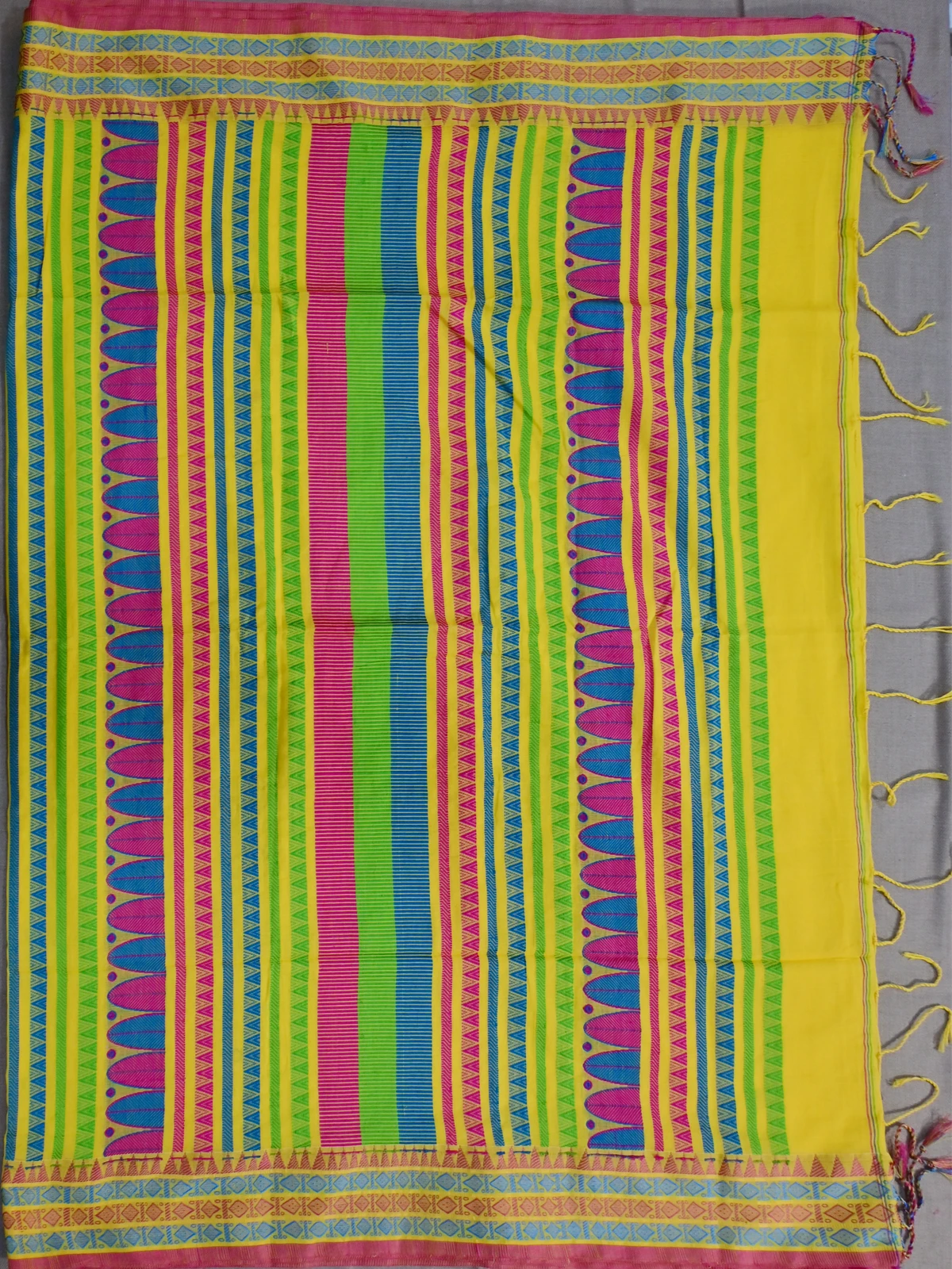 This is a lightweight and soft cotton saree in bright yellow colour, with colourful border of orange and blue. The saree is adorned with colourful butti and colourful pallu with tassels.