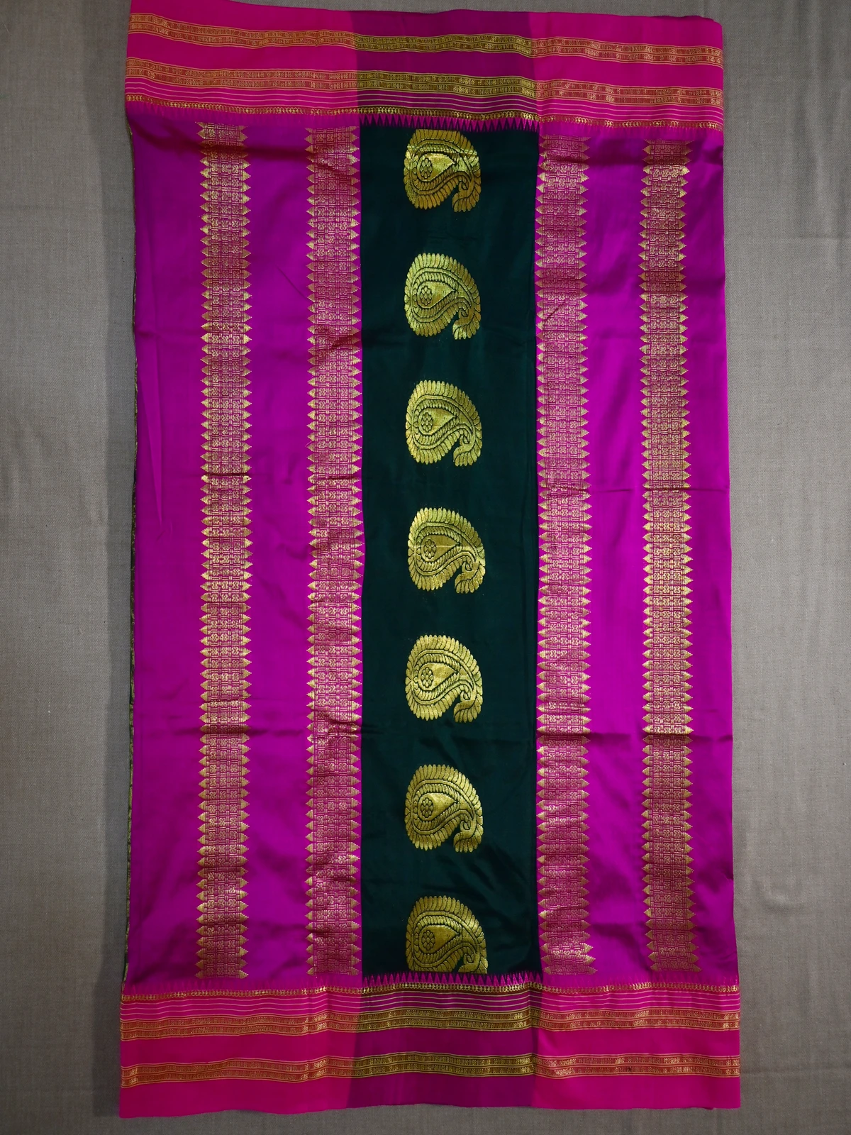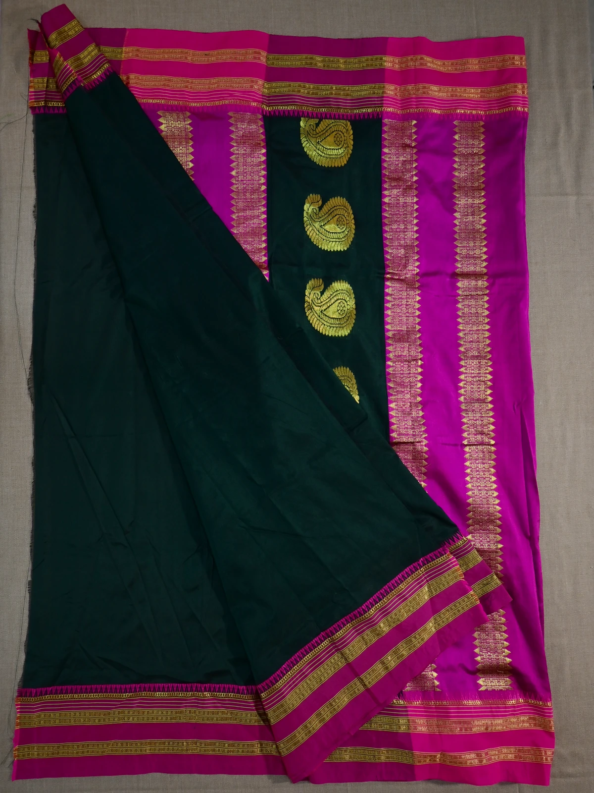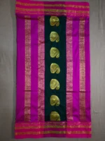 Traditional Narayan Peth (Narayanpet) pure silk saree in dark green with magenta boarder and pallu. The pallu has beautiful jari work.