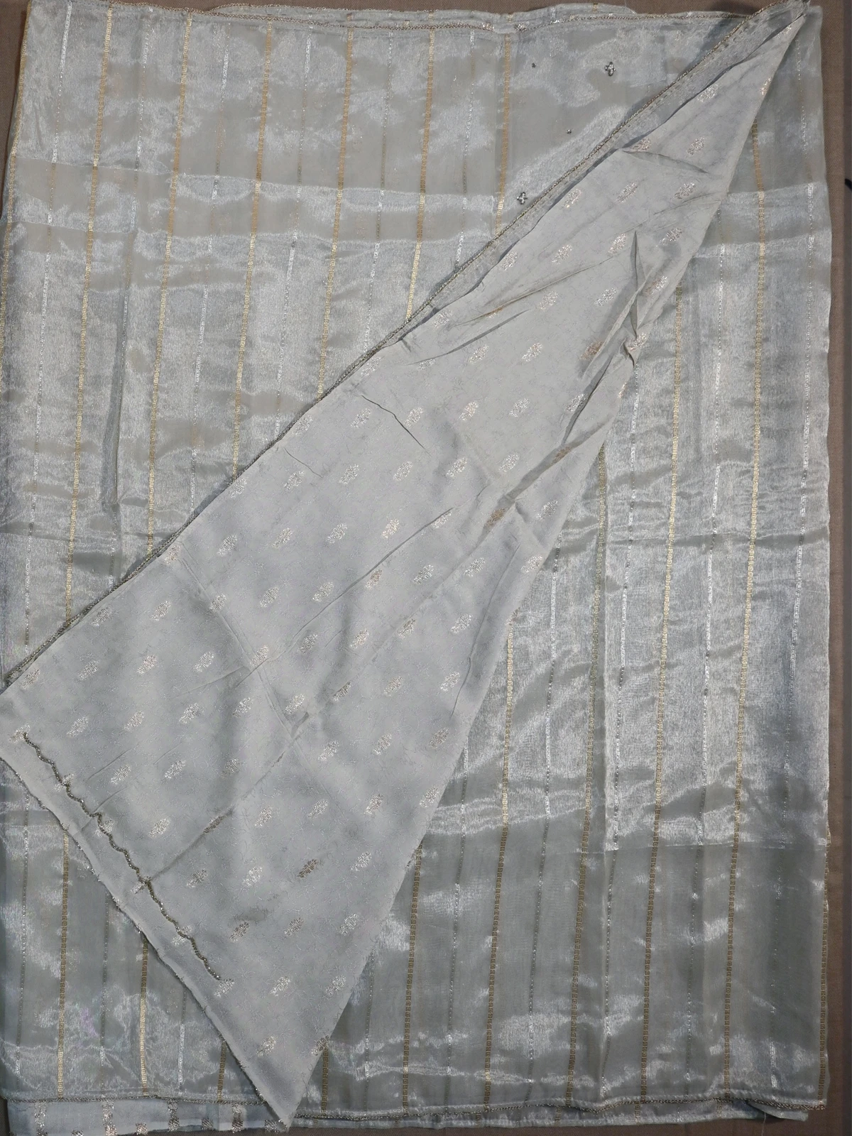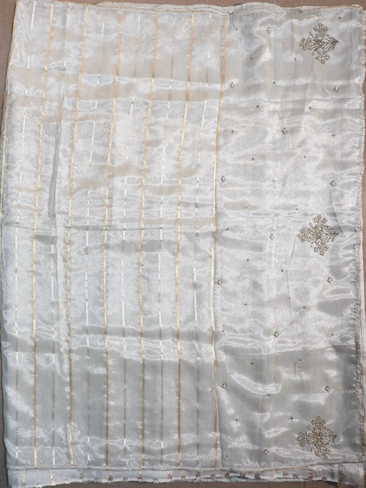 Golden white tissue silk saree with golden and silver shiny stripes including on the pallu.