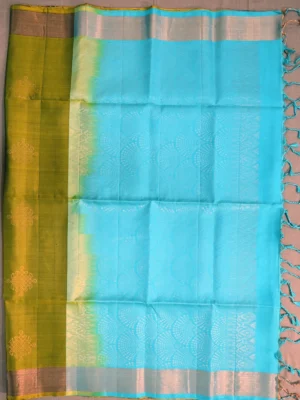 This golden white saree is made up of shiny tissue silk. The shine of the tissue silk is complemented by shiny strips of gold and silver.
