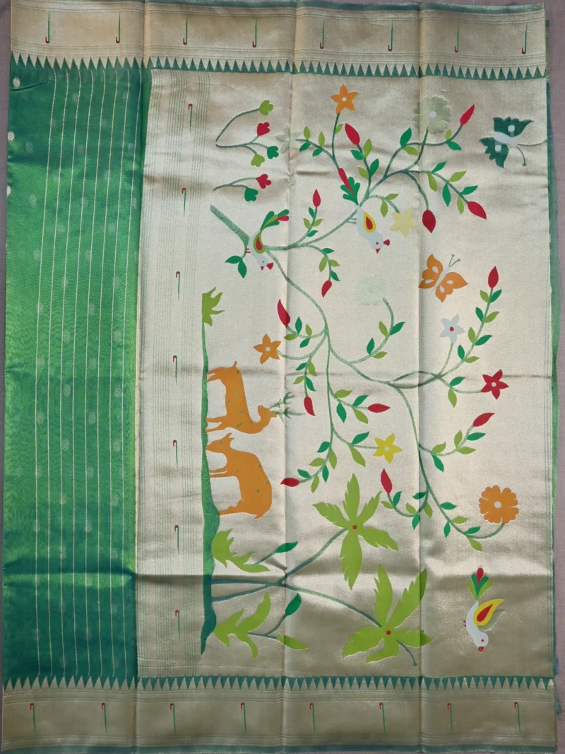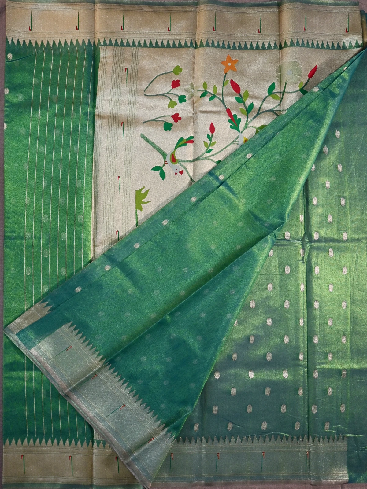 Bright fancy green tissue Paithani saree with all over golden butti and golden border. the saree has a rich Paithani style pallu that enhances the elegance of the saree.