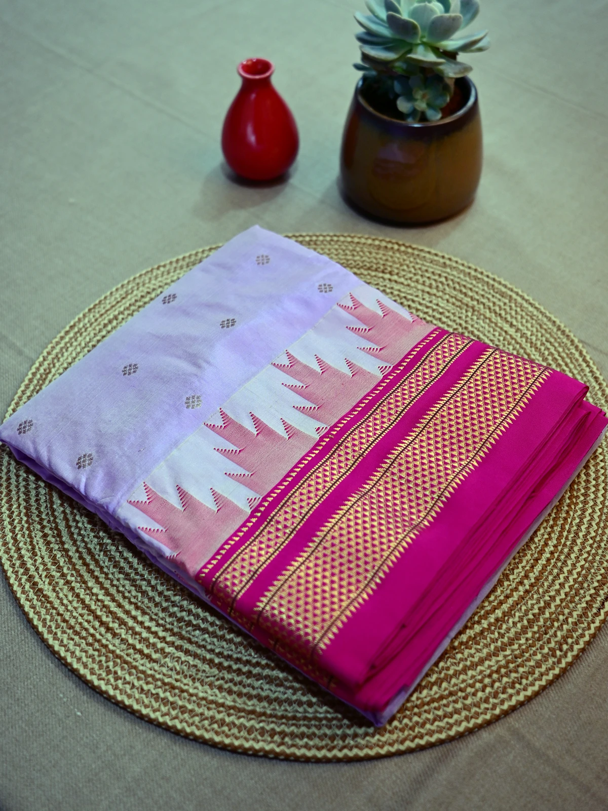 Elegant pure silk Irkal saree with plain lavender body and golden butti all over. Pink border with traditional golden jari work adds to the beauty of the saree.