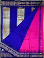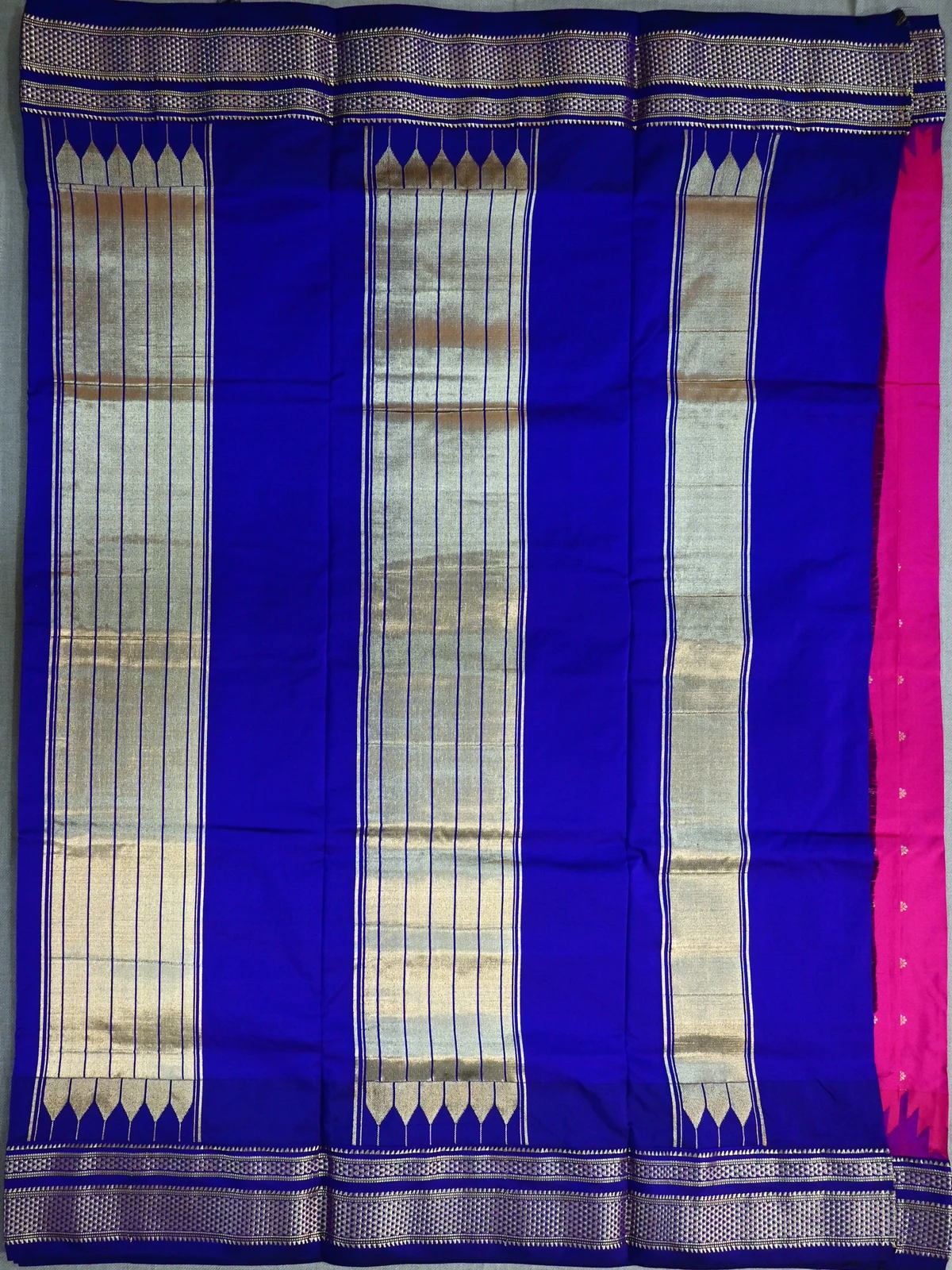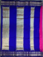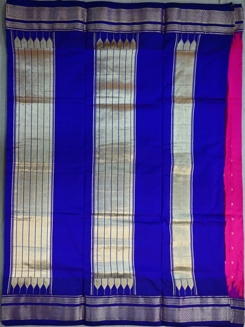 The saree has a traditional Irkal pallu in dark blue and bright shiny golden stripes.