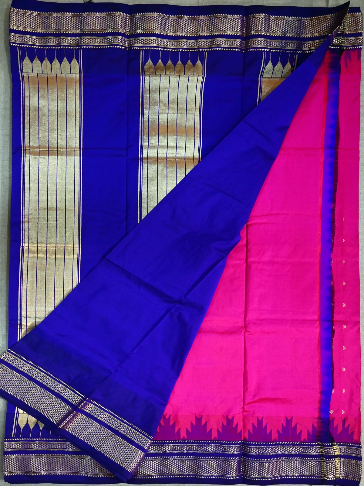 Elegant pure silk Irkal saree with plain magenta body and golden butti all over. Dark blue border with traditional golden jari work adds to the beauty of the saree.