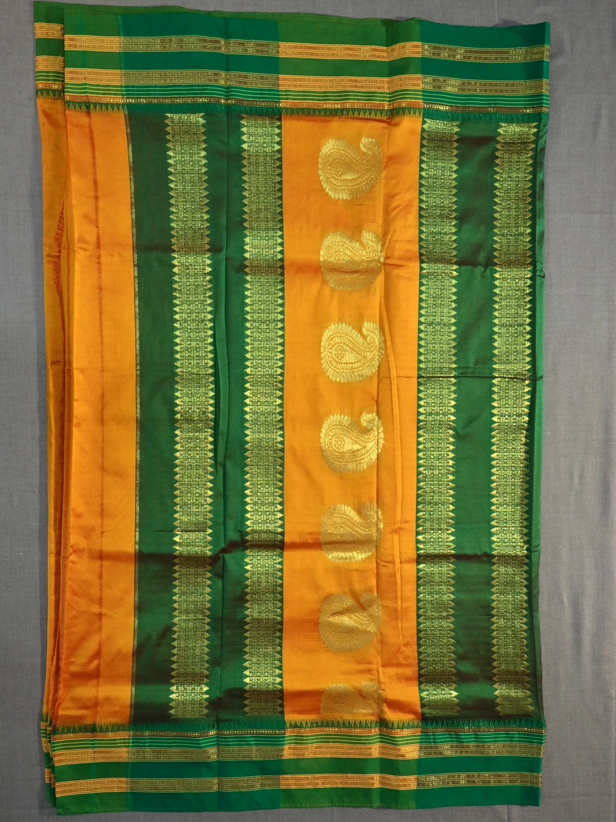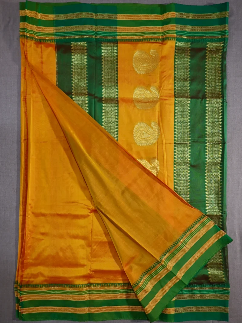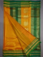 Traditional Narayan Peth (Narayanpet) pure silk saree in mango yellow with green boarder and pallu. The pallu has beautiful jari work.