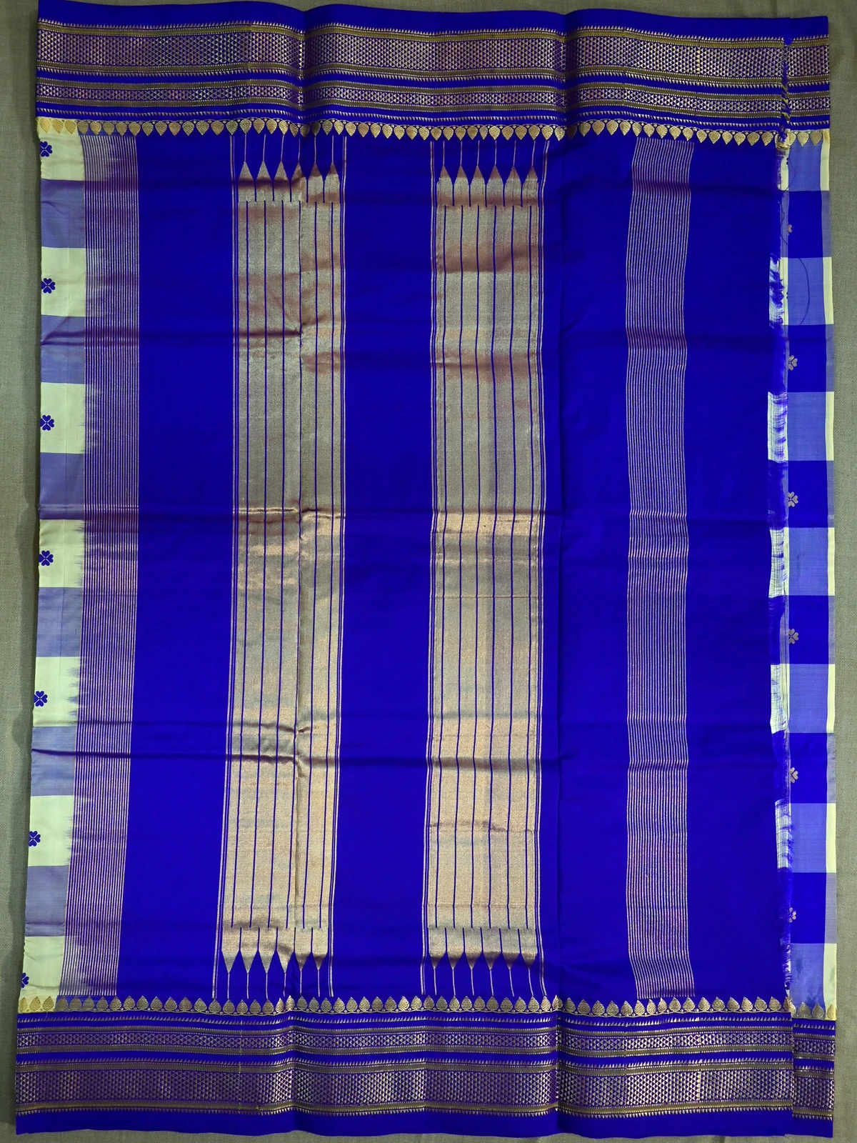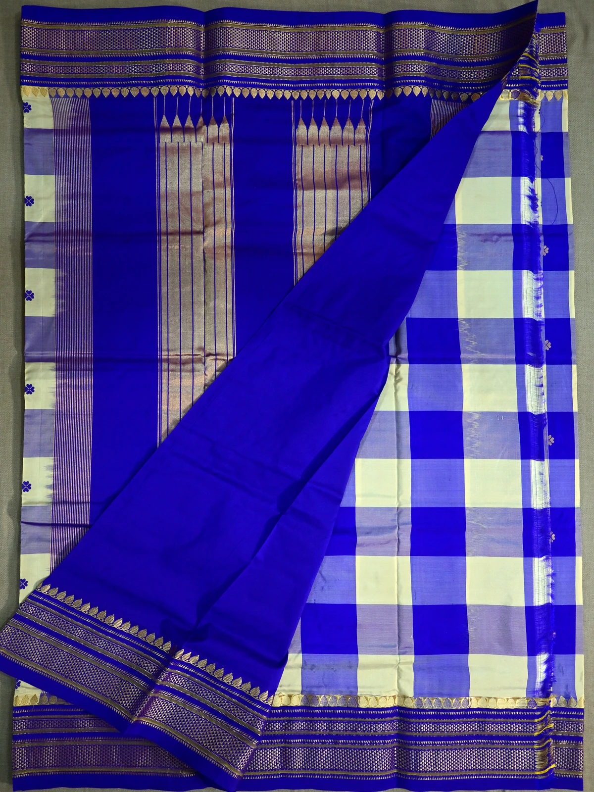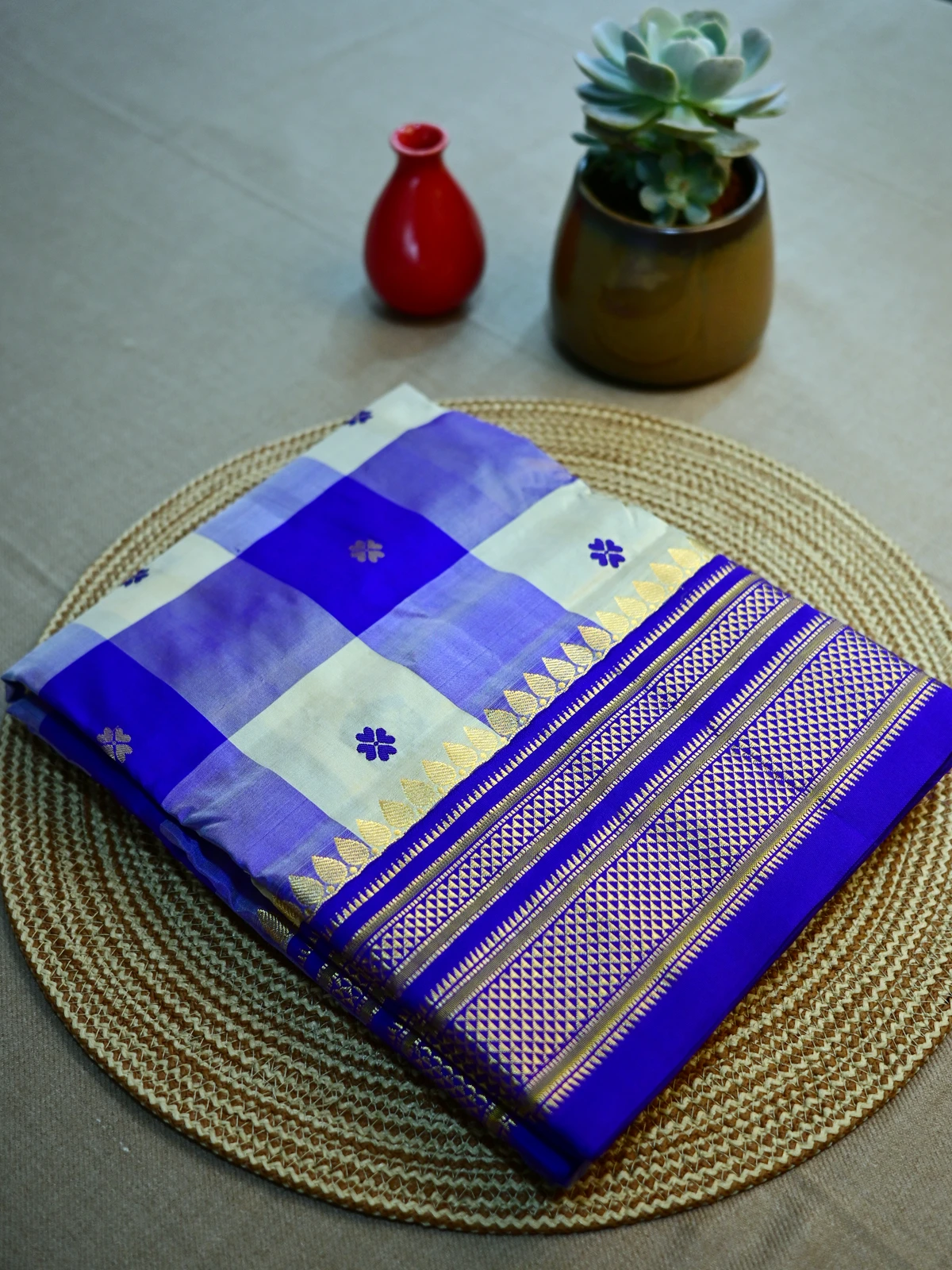 Luxurious, shiny Irkal pure silk saree with medium sized royal blue checks and flower butti in royal blue and gold jari, with traditional Irkal jari border and jari pallu.