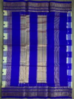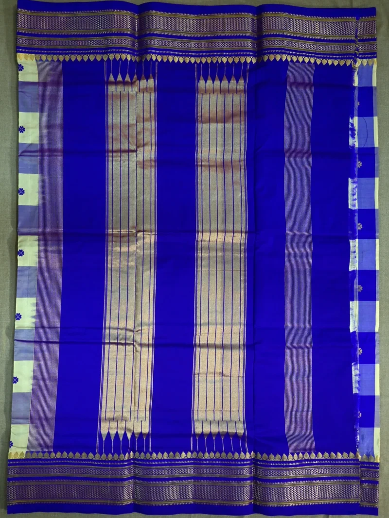 The pallu of this saree is the traditional Irkal pallu, with a combination of royal blue and bright shiny golden strips.