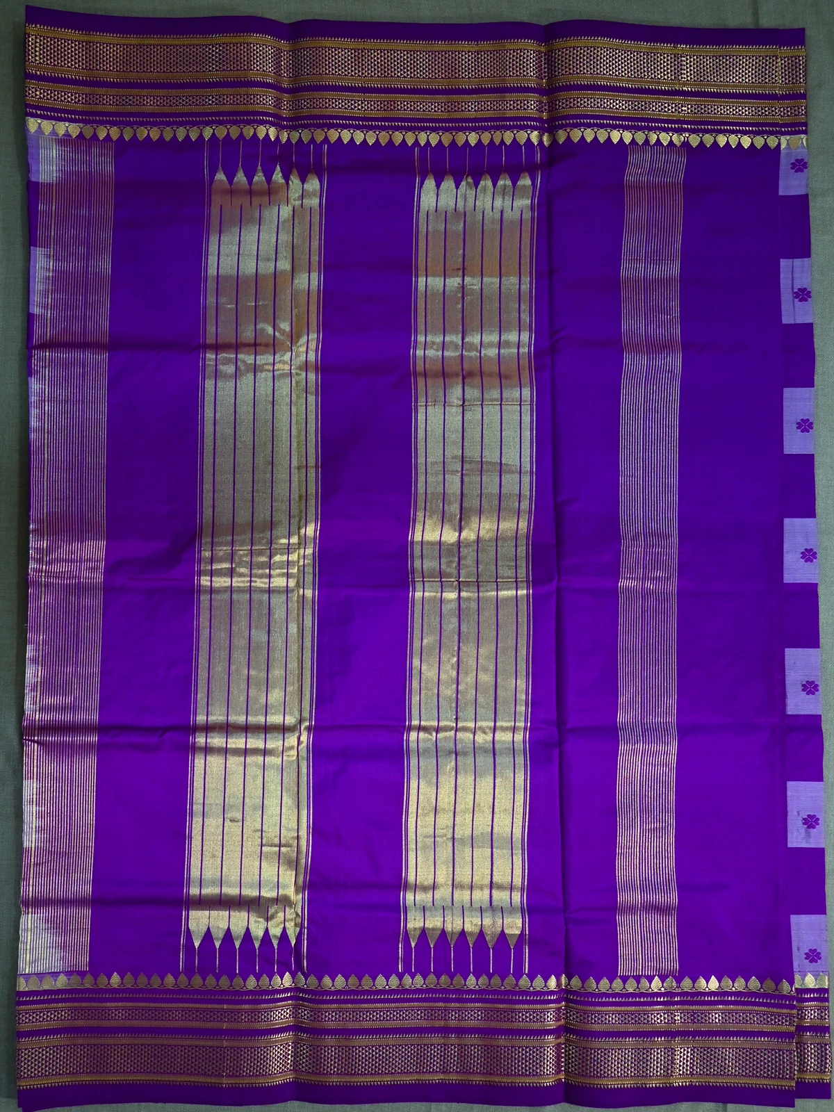 The pallu of this saree is the traditional Irkal pallu, with a combination of purple and bright shiny golden strips.