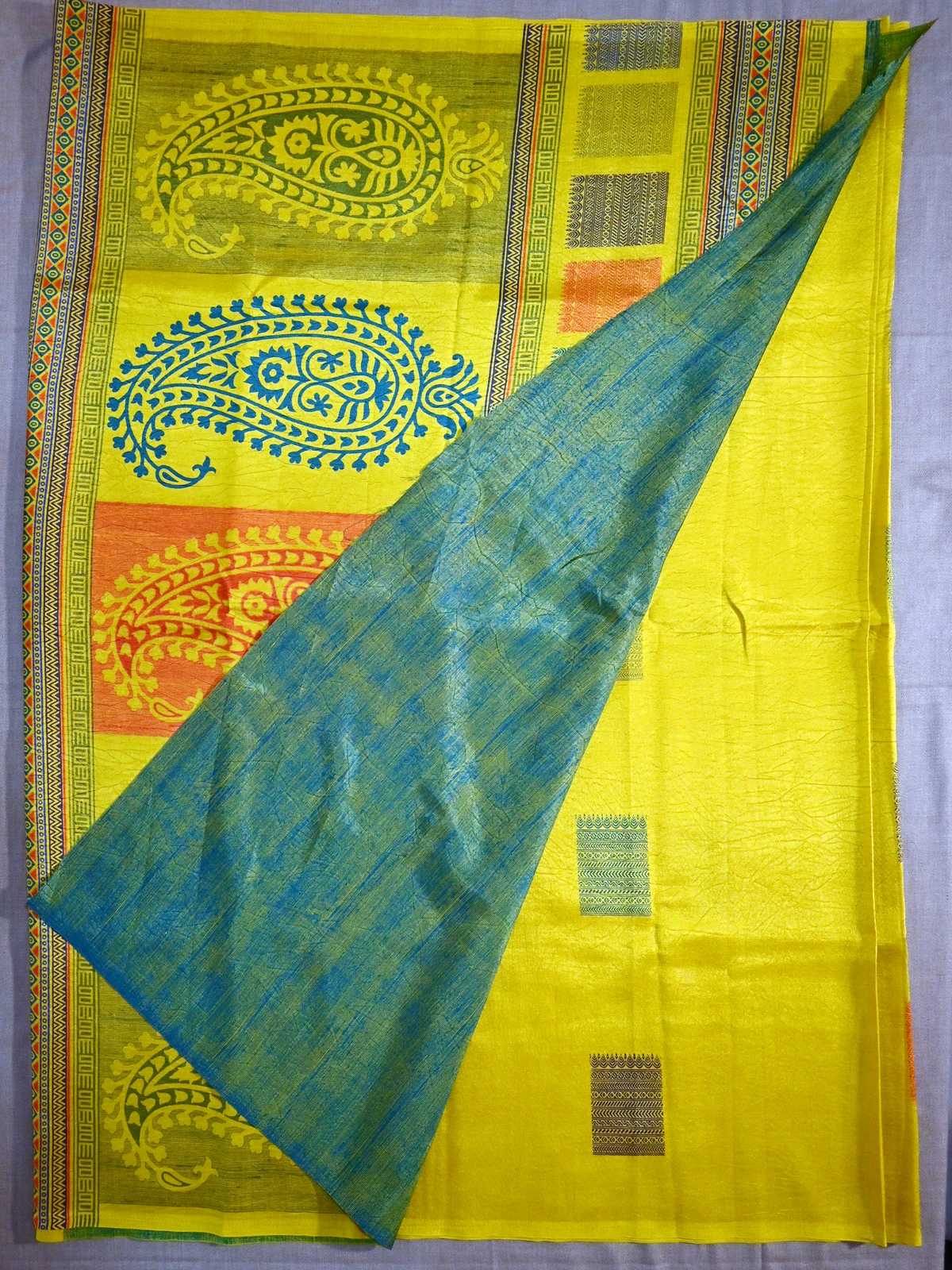 Bright mustard yellow printed Kashimiri silk saree with multi-coloured block design and beautiful pallu.