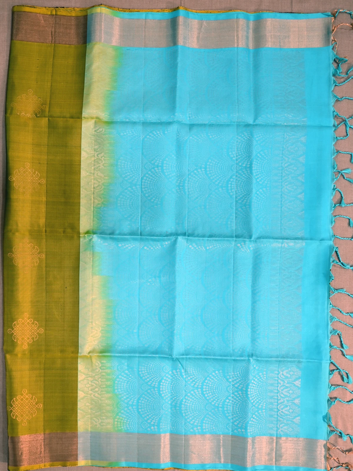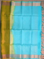 Beautiful, light weight pure silk saree in olive green with kolam motif all over and bright sea blue pallu.