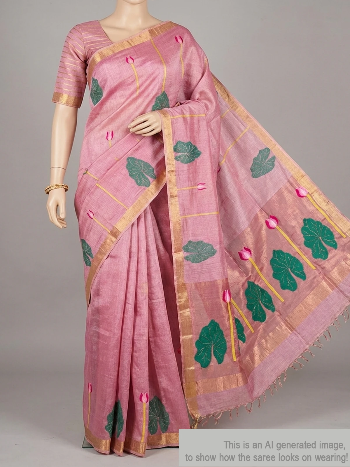 A beautiful blend of pure silk and linen. Lightweight, soft onion pink saree with bold lotus leaf and lotus buds motif on pallu, and along the border.