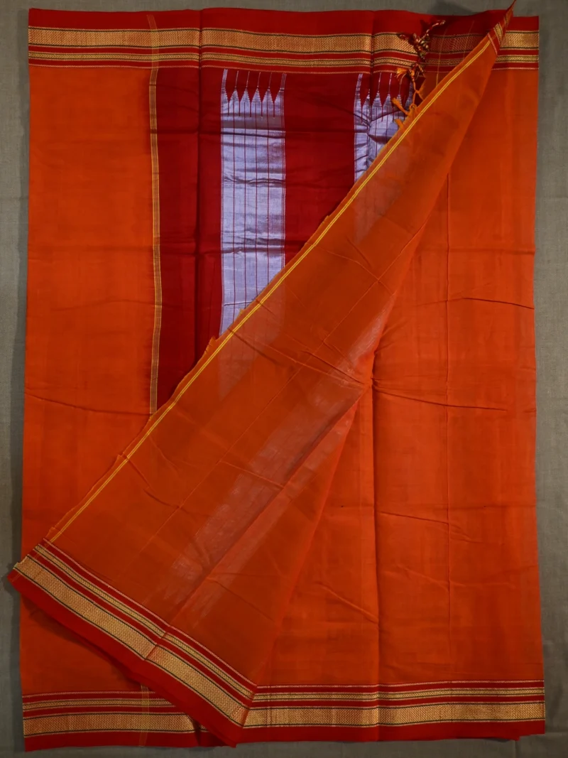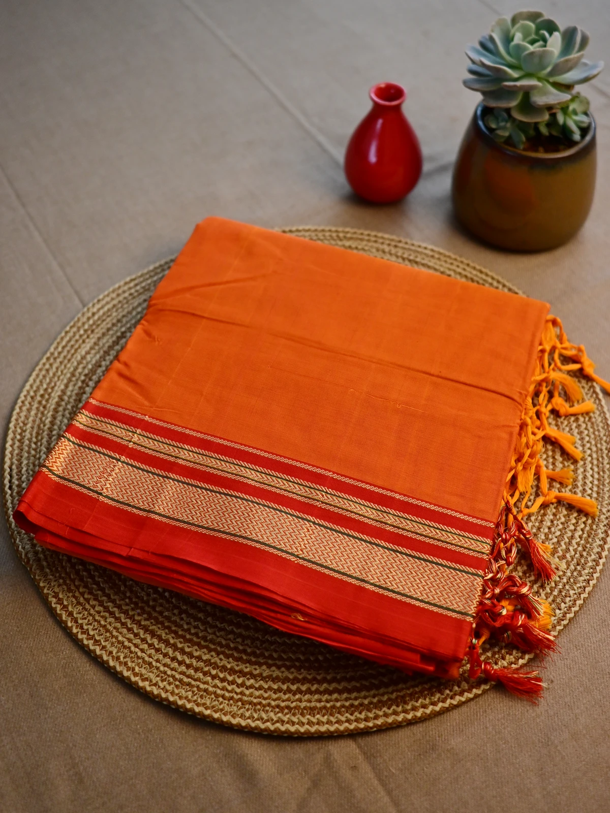 Premium mercerised cotton Irkal saree with plain orange colour and red border with traditional design in golden thread.