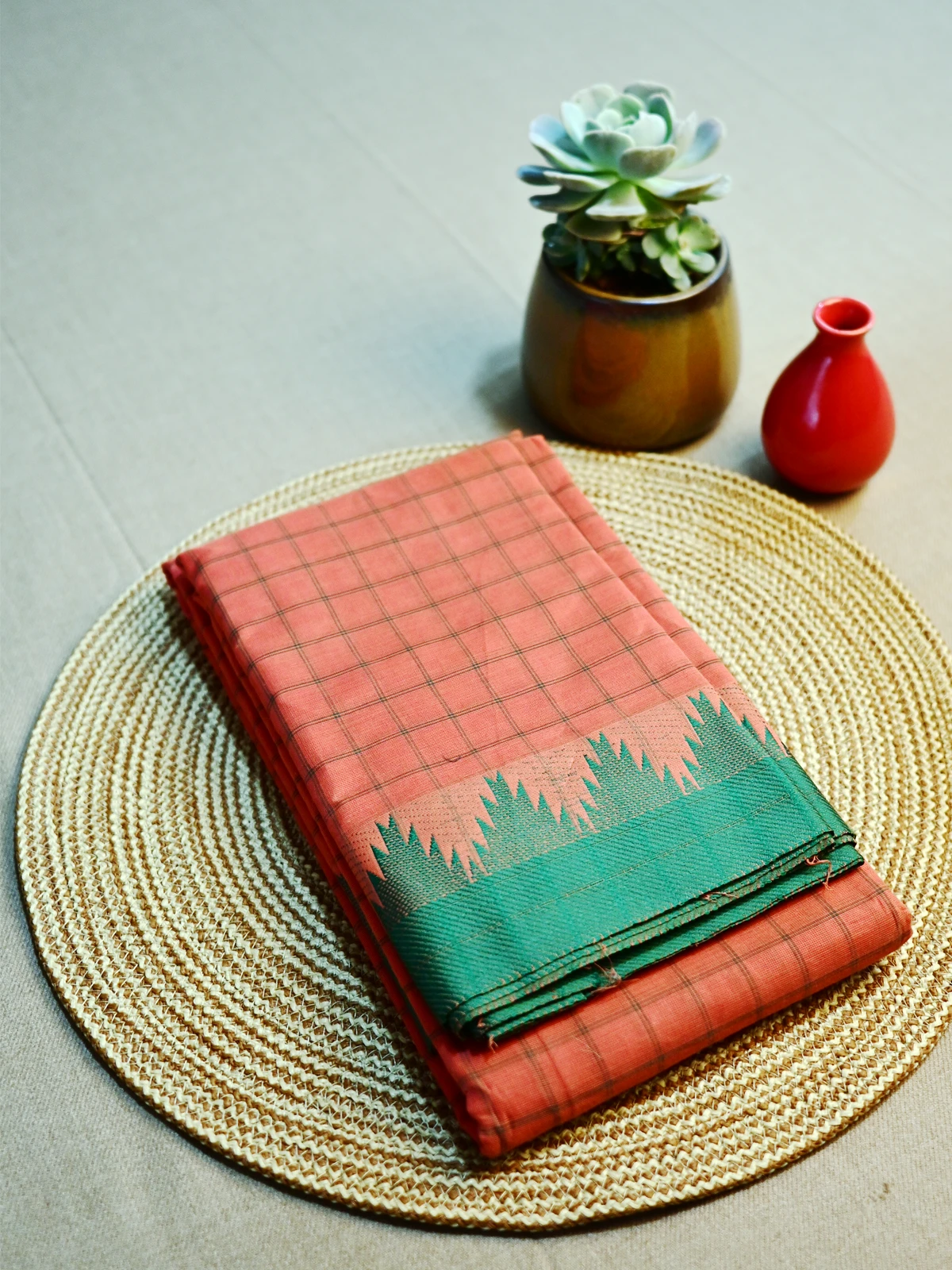 Beautiful cotton saree in peach colour with green checks and green temple border.