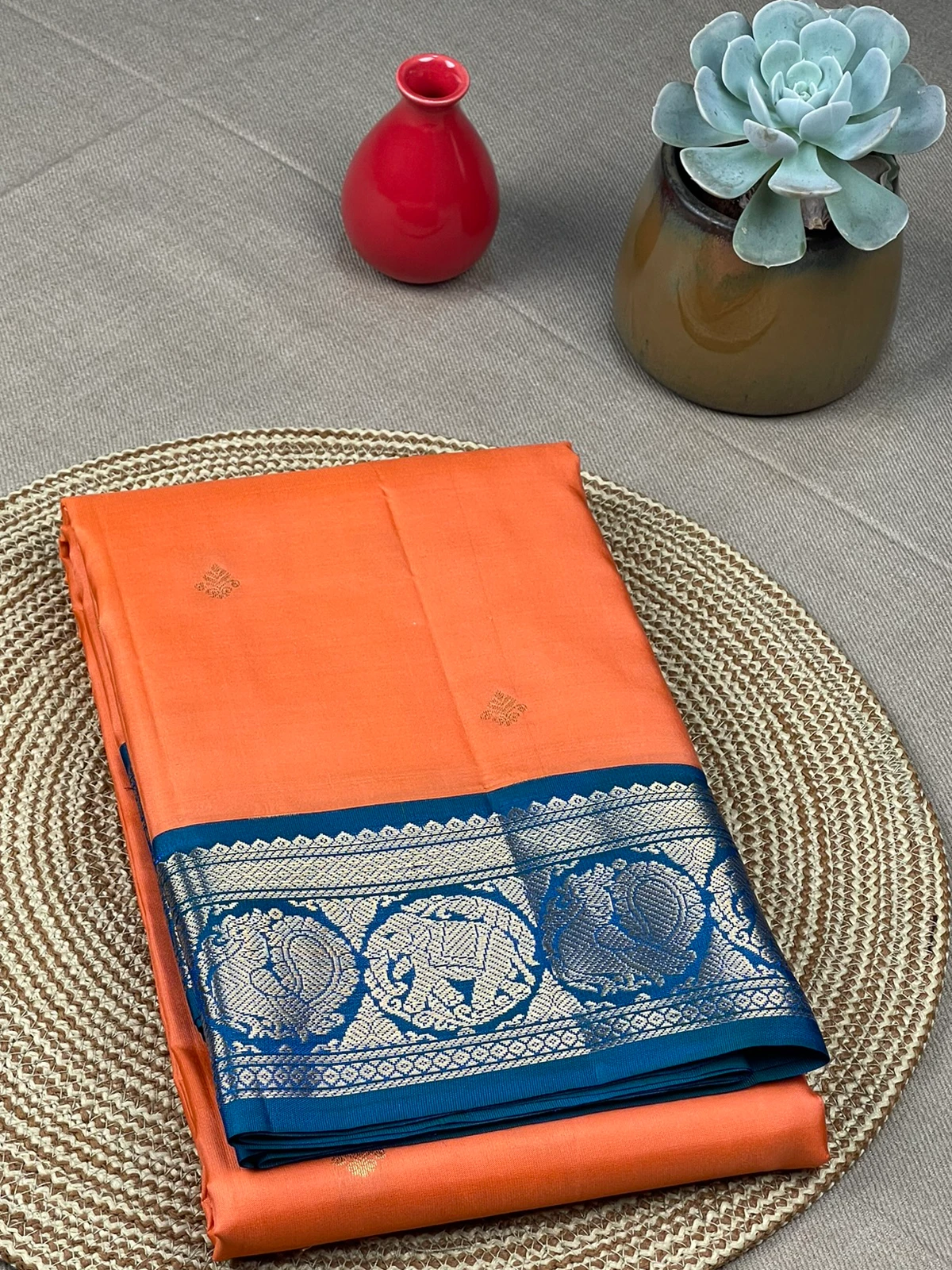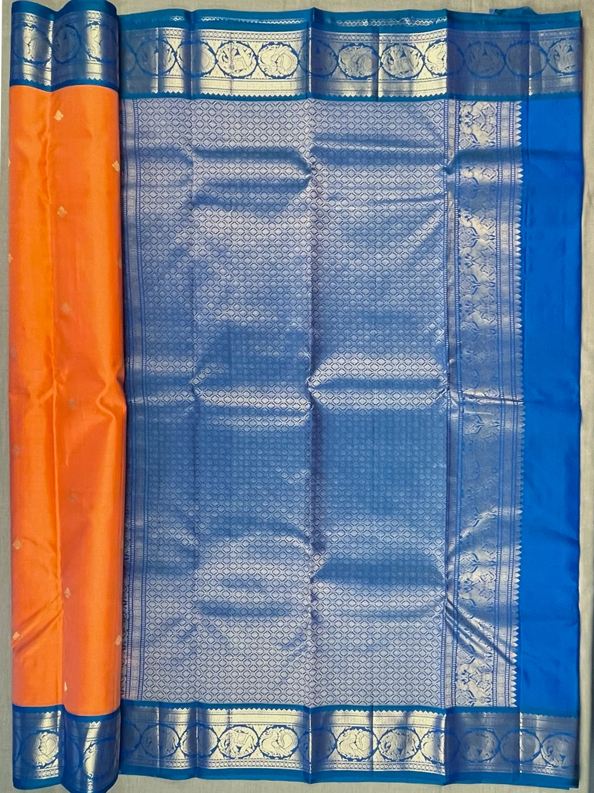 The pallu is plain peacock blue.