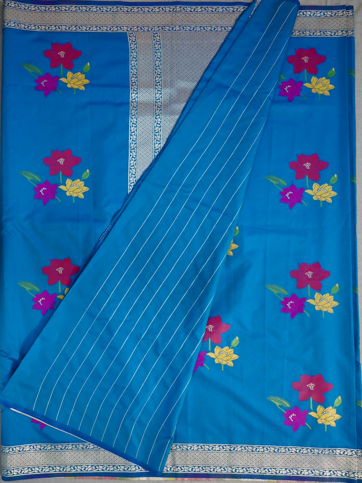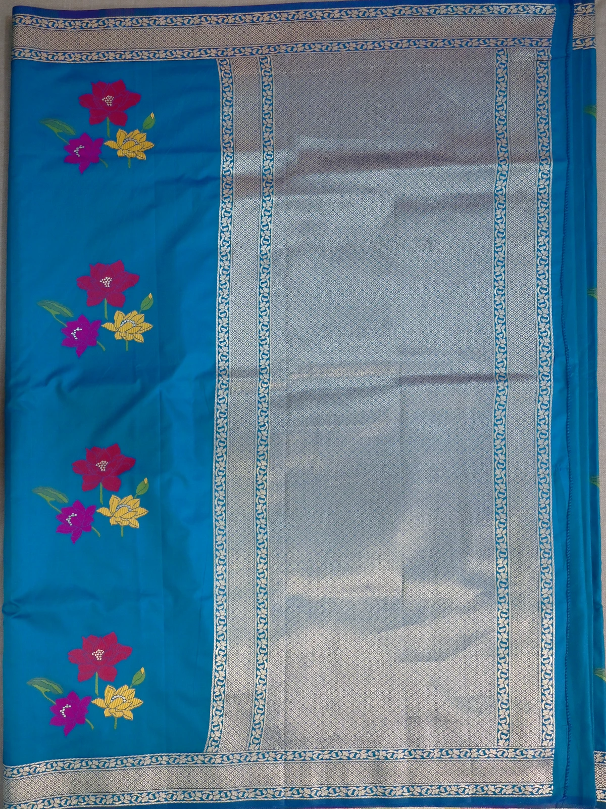 This beautiful semi Katan silk saree has beautiful multi-coloured floral designs on peacock blue fabric, and small golden border.