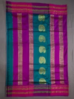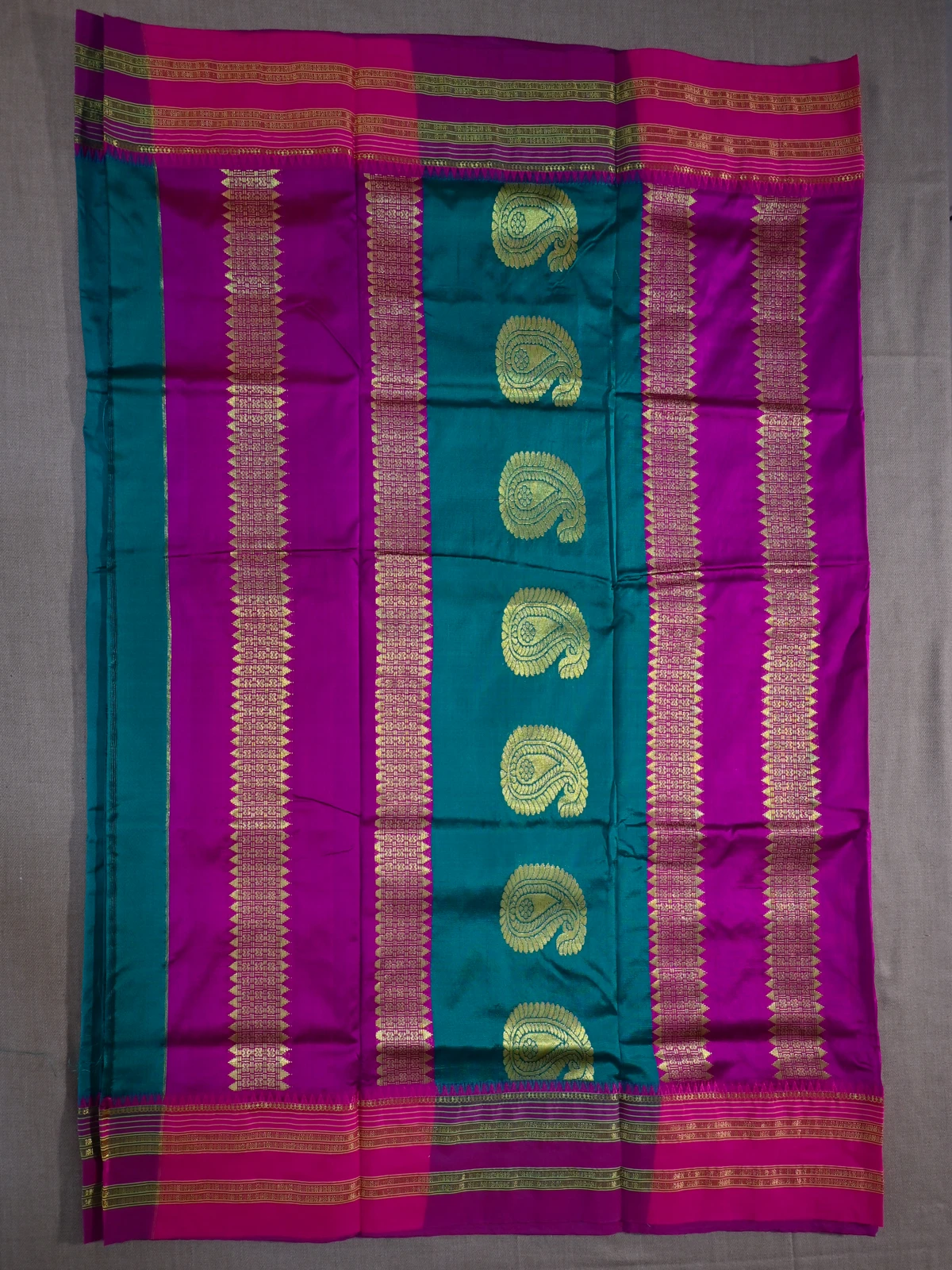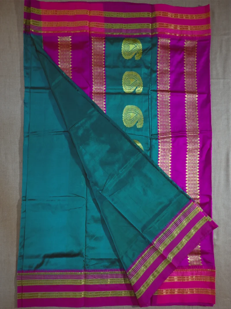 This is a traditional Narayan Peth pure silk saree with lustrous silk fabric in peacock green and contrast colour border in magenta.