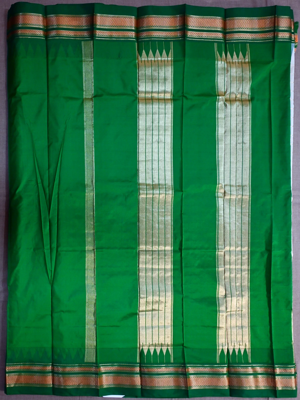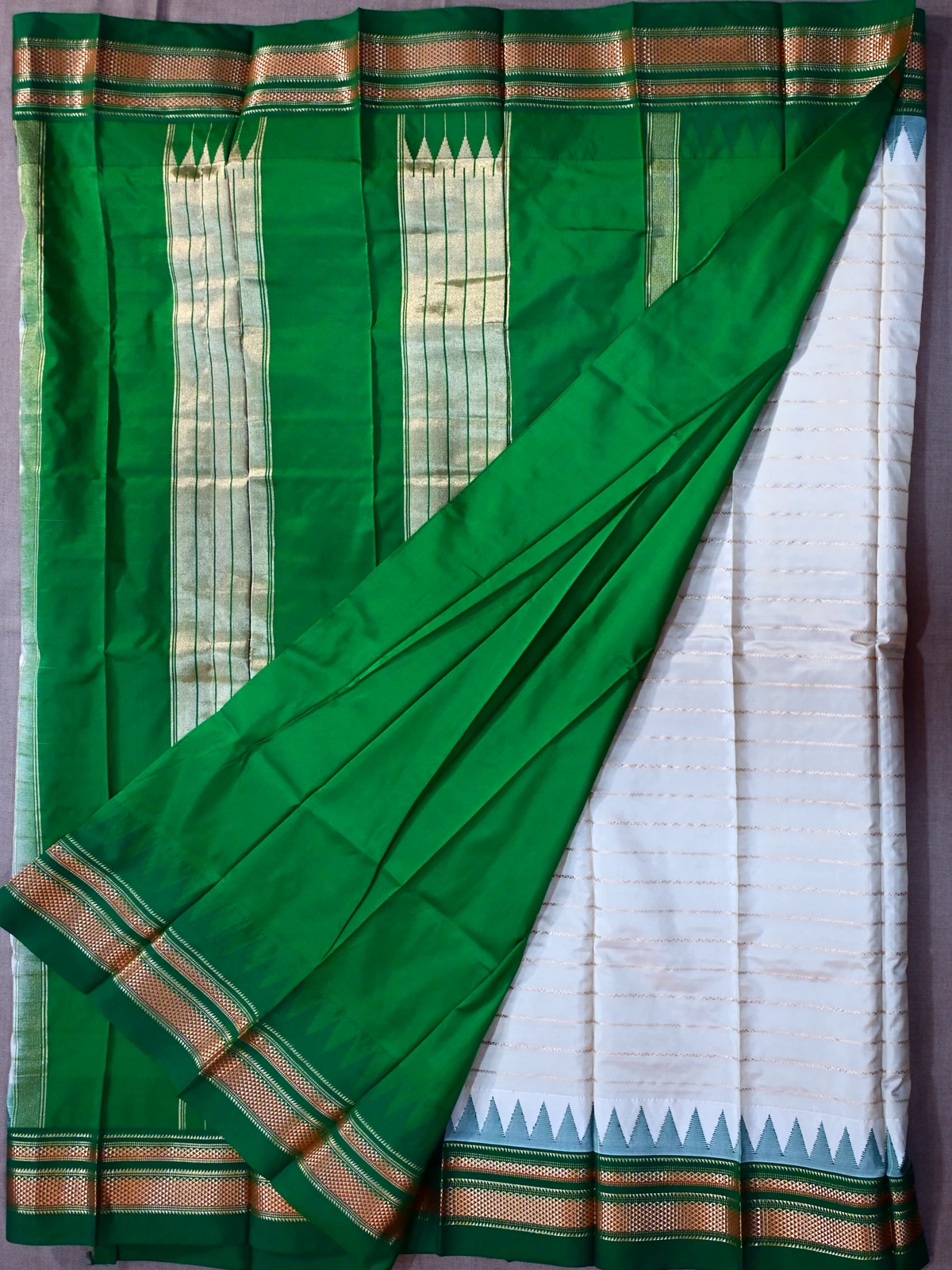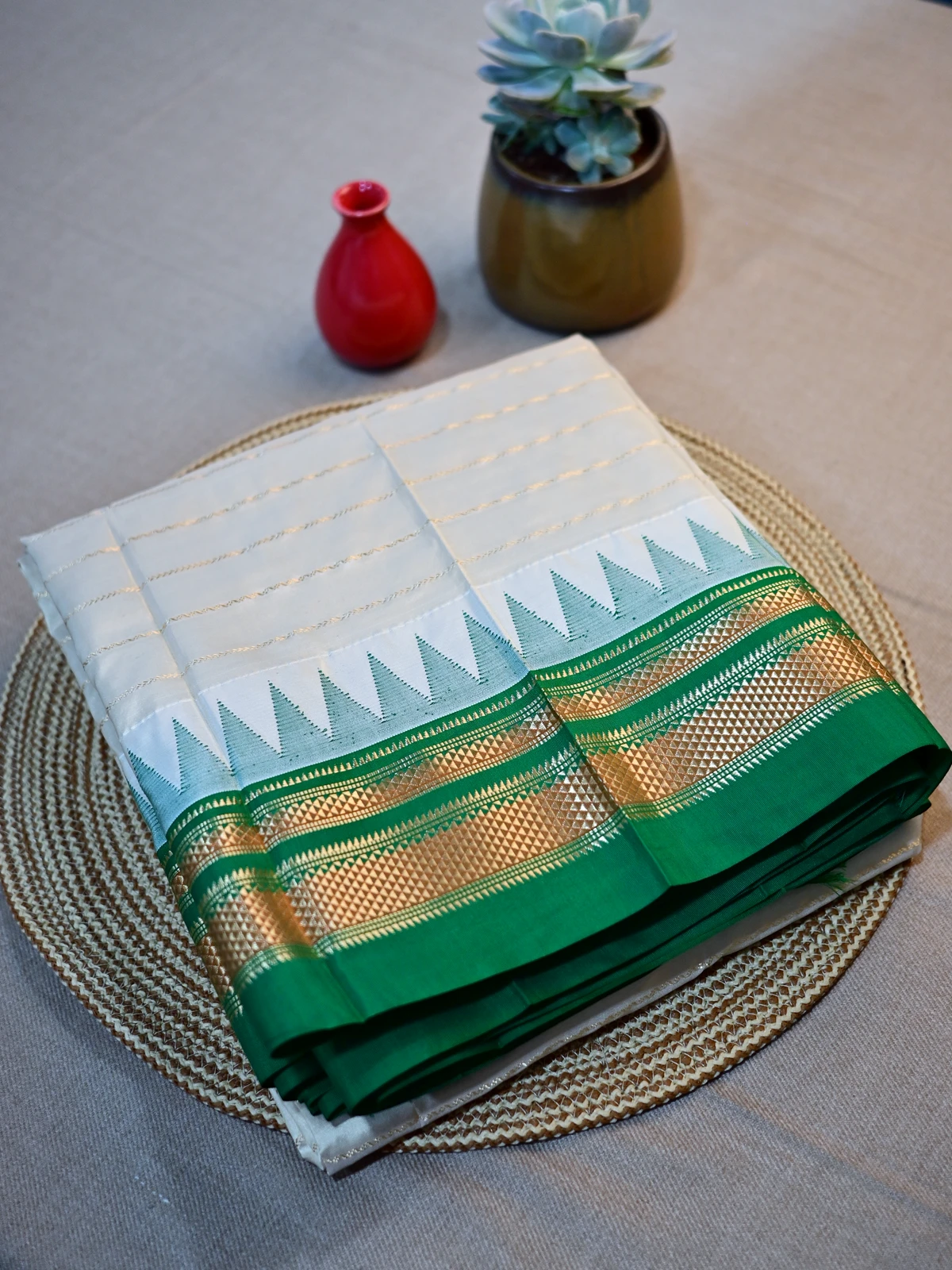 A pure silk Irkal saree with shiny golden lines across pearl coloured body, coupled with rich green border with golden jari work and a light green temple motif.