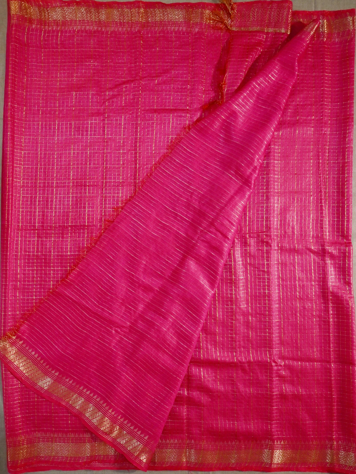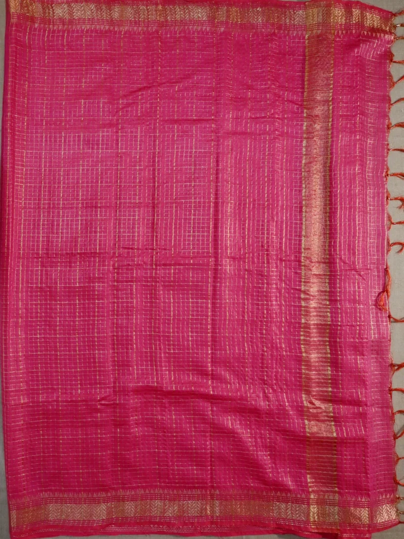 Soft and lustrous dark pink fabric with delicate golden checks all over, with a gold jari border and pallu with beautiful tassels.