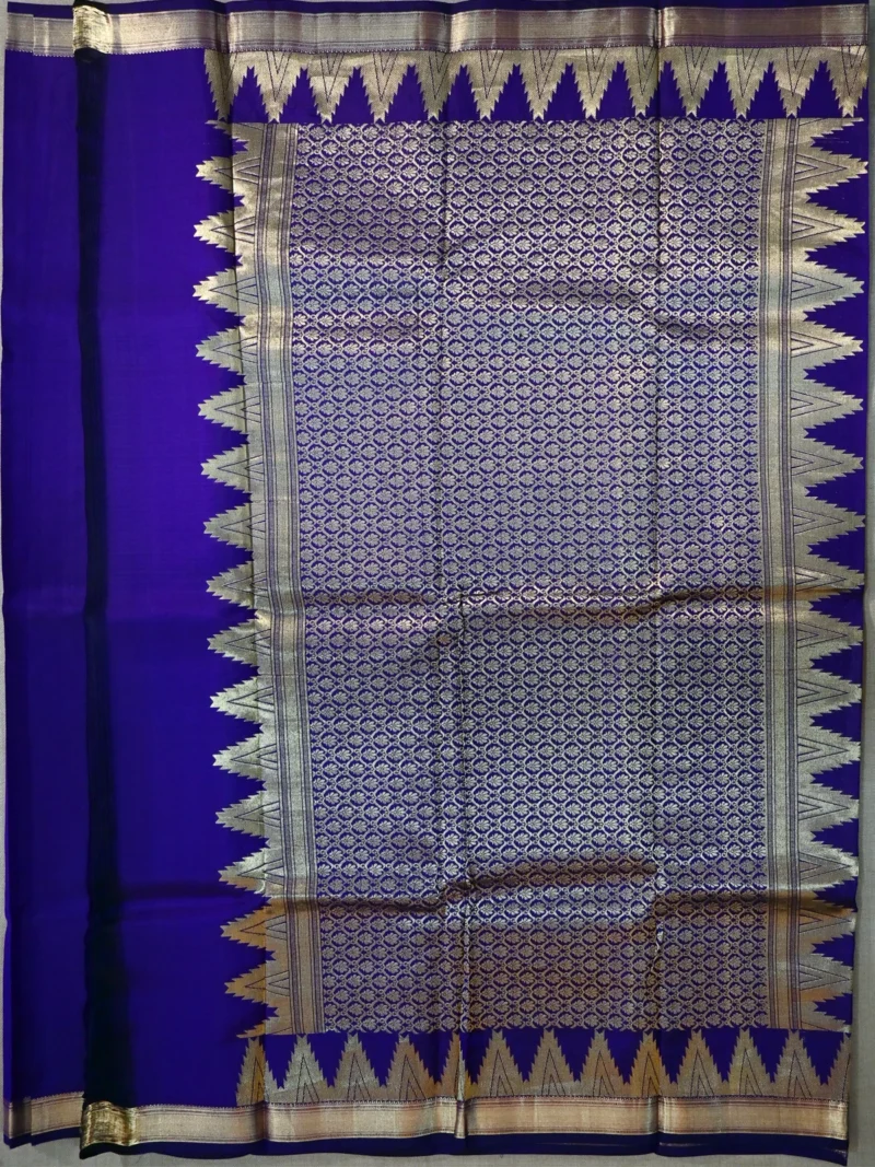 This is a very elegant Mysore crepe silk saree in plain rich purple colour, and small golden jari border.