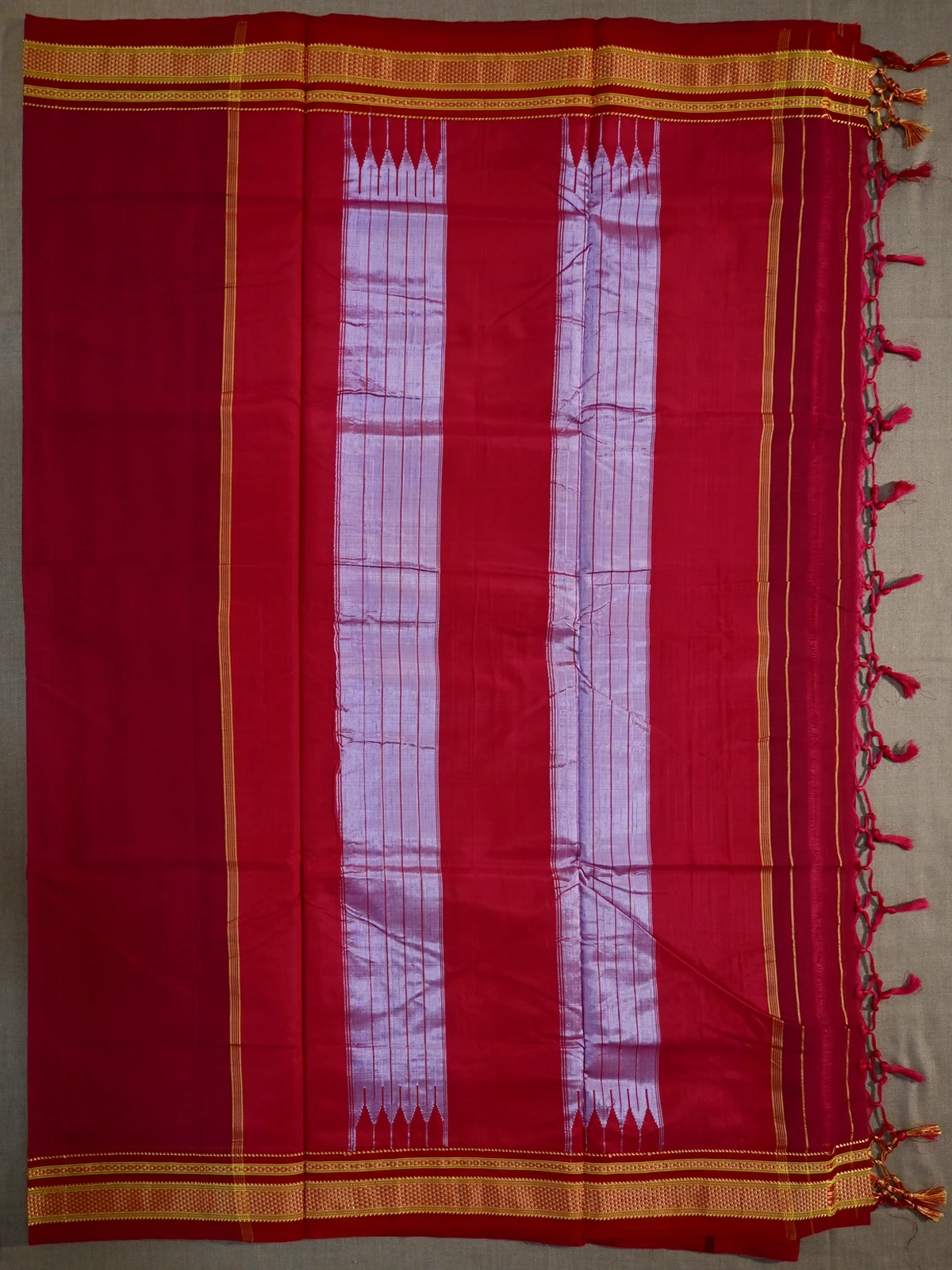 Premium mercerised cotton Irkal saree with plain red colour and red border with traditional design in golden thread.