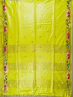Bolden golden butti and colourful embroidery border accentuates the bright yellow colour of the saree.