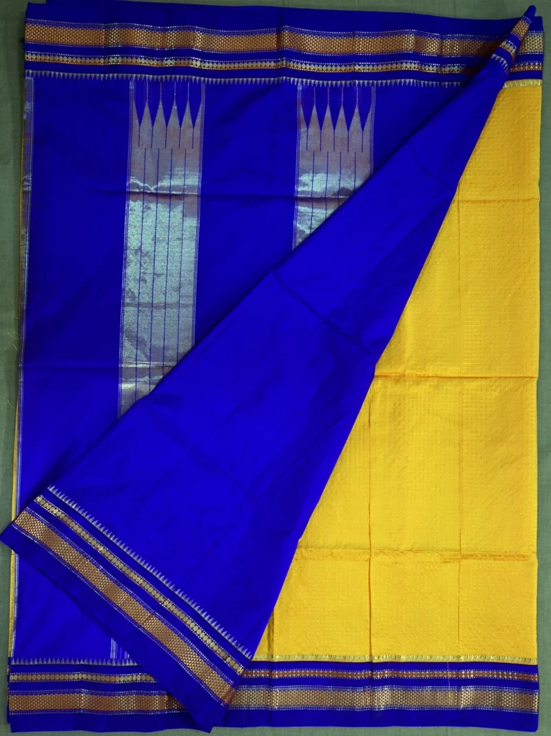 Pure silk 3ply Irkal saree with small checks in golden jari on bright yellow and contrast border and pallu in royal blue. The border is adorned with traditional golden jari work.