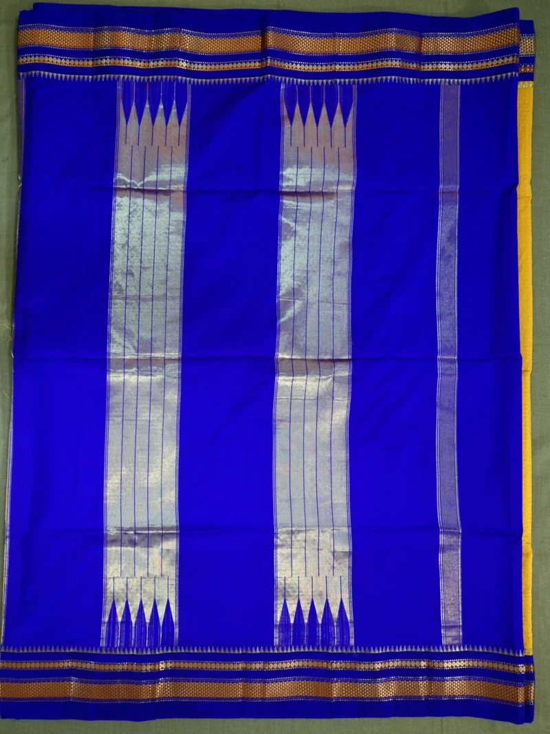 The saree has a traditional Irkal pallu in royal blue and bright shiny golden stripes.